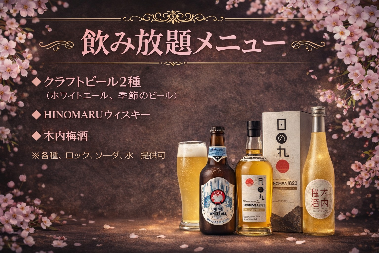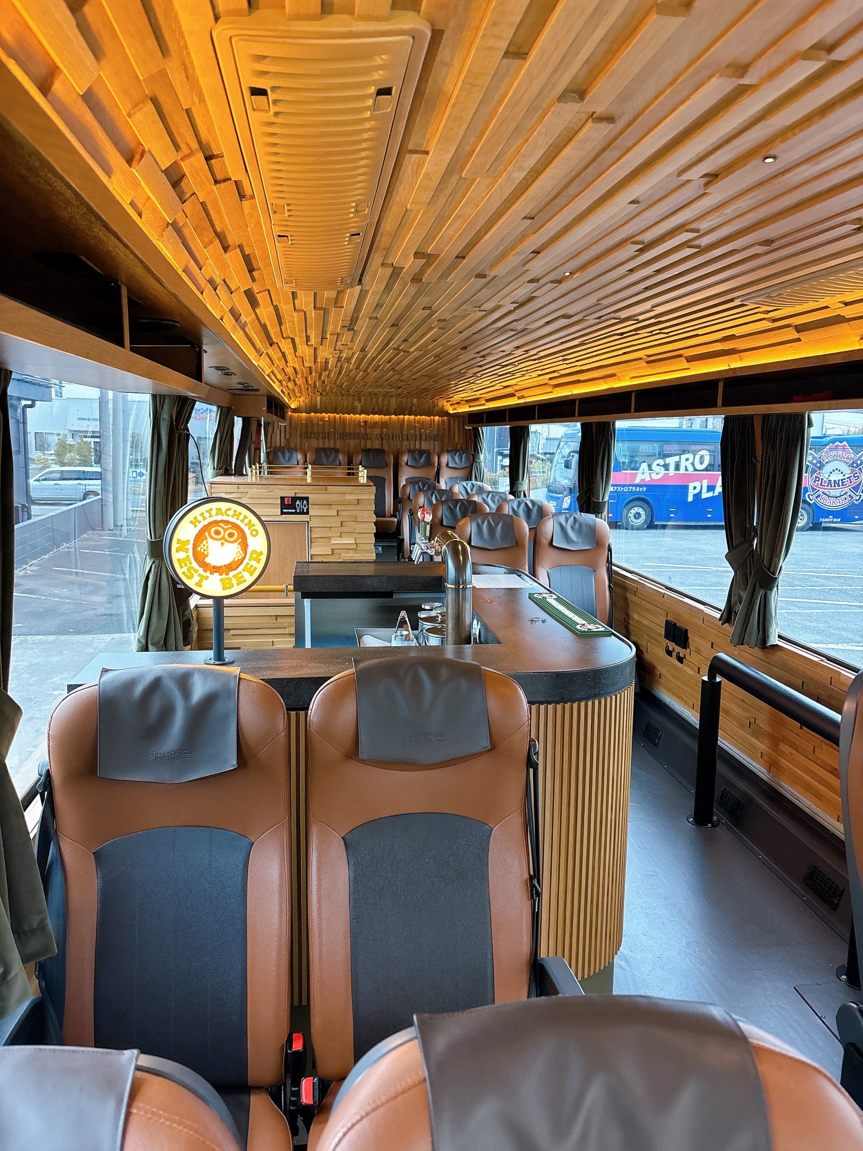 ◆バス車内にはタップ付きのバーカウンターを設置し、出発までの停車時間、道中となるバス車内でも、常陸野ネストビール、日の丸ウイスキー、梅酒とバラエティに富んだ木内酒造のお酒の数々をフリーフローでお楽しみいただけます。