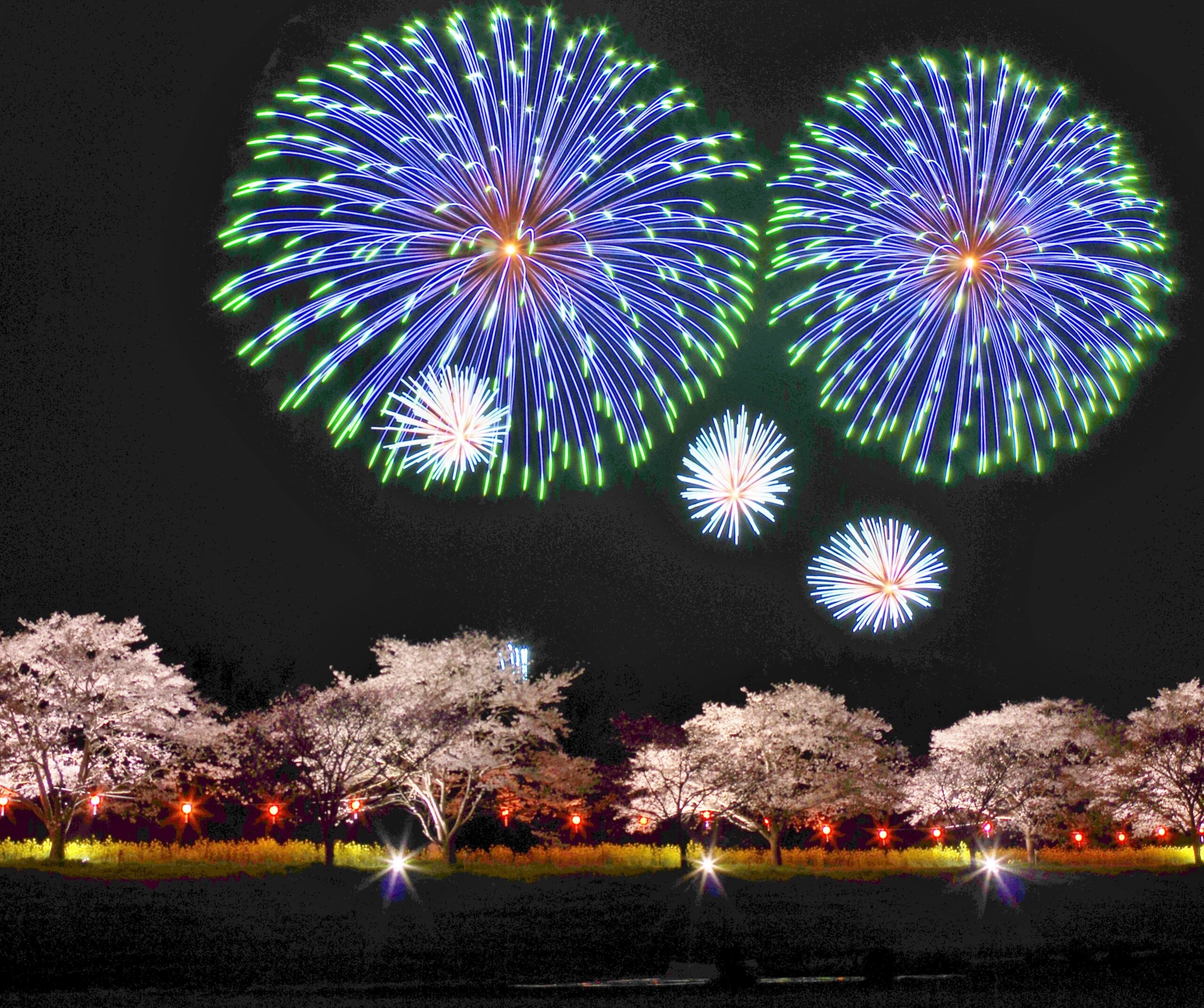 菜の花との競演も美しく、3月28日(土曜日)から4月19日(日曜日)のライトアップ期間は美しい夜桜が見られます。 また、昨年度大好評だった竹あかりライトアップ「DRAGON BAMBOO」も同時開催します!4月4日(土曜日)には、内閣総理大臣賞通算22回受賞の野村花火工業株式会社による花火大会も開催します。