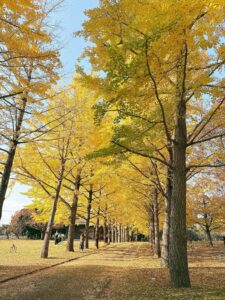約60本のイチョウ並木が一気に黄色く染まり、11月下旬ころまでこの景色を楽しむことができます。